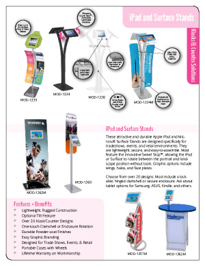 The Port Land iPad Kiosks™ are anything but dull. They are attractive, lightweight, and affordable. The locking clamshell frame rotates with the unique Swivel Stop™ feature, allowing you to seamlessly reposition your iPad to Portrait or Landscape mode. The kiosks are made from durable engineered aluminum and assembly in minutes. The MOD-1353 is designed for (1) iPad with (2) literature holders. The MOD-1355 is designed for (2) iPads and (2) literature holders. There's even an all literature holder version -- the MOD-1354.
