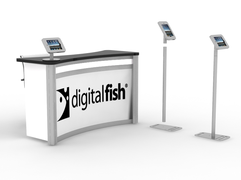 The MOD-1370 has a split personality. It's a full feature, full-height iPad Kiosk which easily converts to a convenient iPad Counter Stand. It's constructed from lightweight durable engineered aluminum extrusion, built the withstand the years of trade show or retail abuse. The base rotates 360 degrees or can be locked to a fixed position. The rotating clamshell frame swivels between portrait and landscape, and has two anti-theft locks. There's even the option of graphics on the face plate or a rear halo to personize your iPad. The MOD-1370 is an affordable addition to any trade show backwall, counter, or workstation.