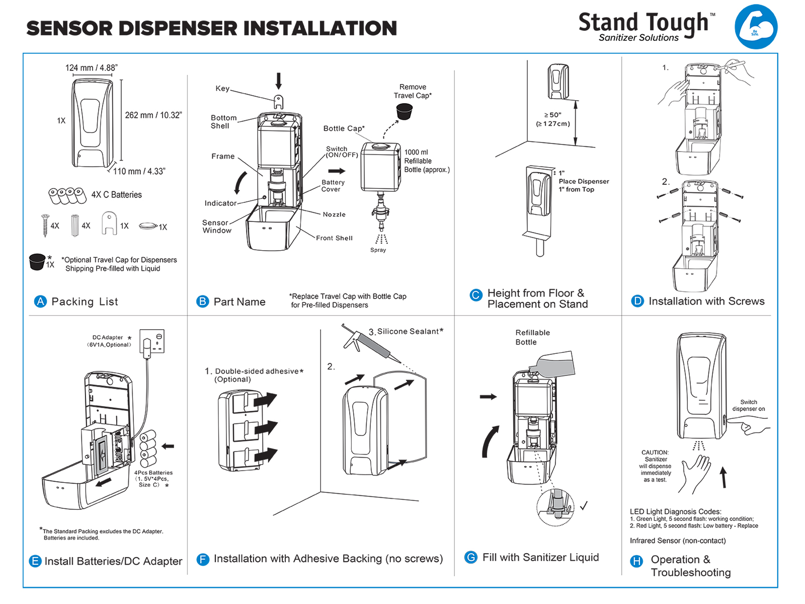 • (1) Automatic Hand Sanitizer Dispenser with Touch-Less Sensor (includes 750 ml of sanitizer and (4) C batteries)