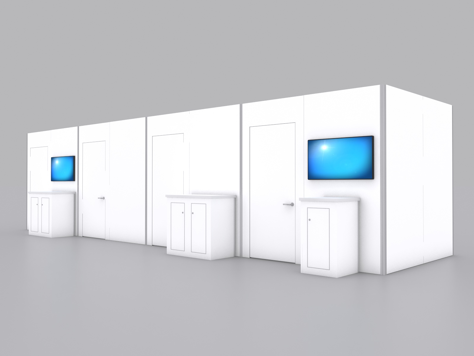 Medical Examination Rooms H -- Image 1Modular Examination Rooms and Registration Stations are ideal as temporary structures, such as offsite facilities, overflow demands, or whenever construction requires short-term offices. The engineered aluminum frames are lightweight and satin anodized, making them incredibly durable and easy to clean. The frames assembly quickly, either with attached clips (Gravitee frames) or with a simple hex key (MODUL structures). The modular design allows them to expand or reconfigure, typically without disassembly of the existing structures.