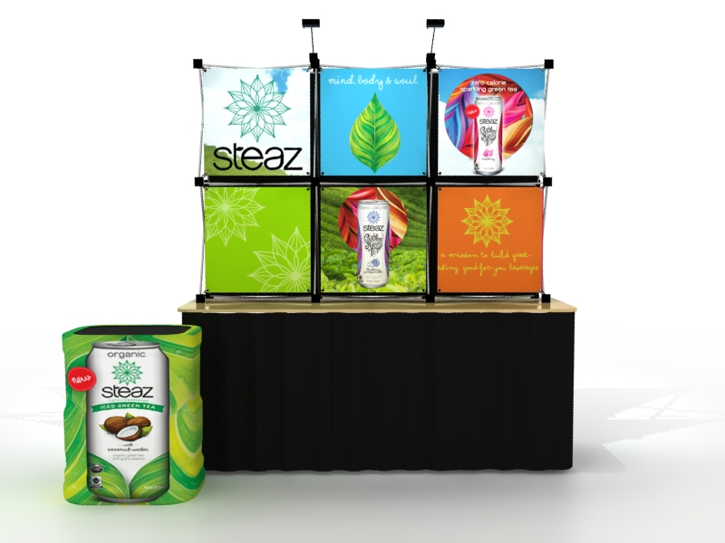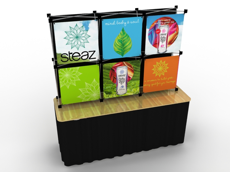 The Quadro Floating Graphic System (FGS) combines convenience and graphic pizzazz into an affordable, portable display. The Quadro frame expands in seconds, and the graphics attach easily with flexible rings. Need to change a graphic for a new product or marketing campaign? No problem. The individual panels make switching graphics quick and cost-effective. Elevate your presentation even more with a stylish printed lycra case wrap, instantly turning storage into a counter. Add lights and a backwall shelf for even more impact. The entire display assembles quickly, and disassembles even faster for a quick exit.
