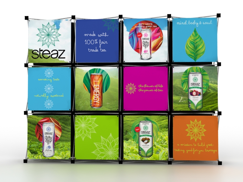 The Quadro Floating Graphic System (FGS) combines convenience and graphic pizzazz into an affordable, portable display. The Quadro frame expands in seconds, and the graphics attach easily with flexible rings. Need to change a graphic for a new product or marketing campaign? No problem. The individual panels make switching graphics quick and cost-effective. Elevate your presentation even more with a stylish printed lycra case wrap, instantly turning storage into a counter. Add lights and a backwall shelf for even more impact. The entire display assembles quickly, and disassembles even faster for a quick exit.
