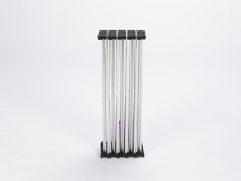 The fabric or graphic panels hang on pins that adhere to detachable channel bars with a magnet-to-magnet connection. The panels are rollable to fit in the roto-molded case with wheels. The number of panels depends on the size of the frame.