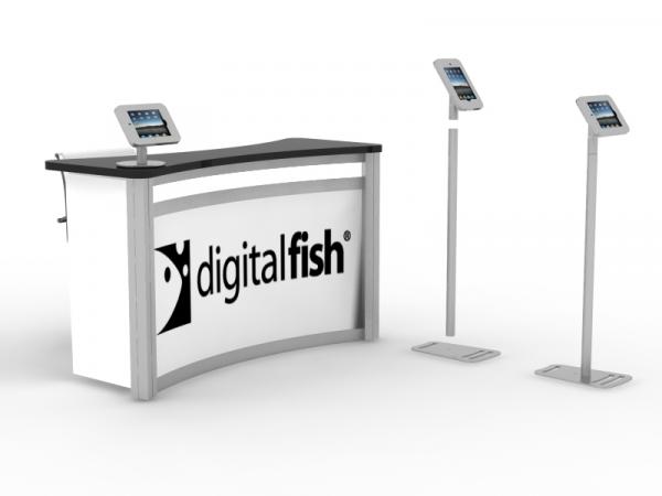 MOD-1370 Convertible iPad Kiosk and Counter Stand -- Image 1The MOD-1370 has a split personality. It's a full feature, full-height iPad Kiosk which easily converts to a convenient iPad Counter Stand.   It's constructed from lightweight durable engineered aluminum extrusion, built the withstand the years of trade show or retail abuse. The base rotates 360 degrees or can be locked to a fixed position. The rotating clamshell frame swivels between portrait and landscape, and has two anti-theft locks. There's even the option of graphics on the face plate or a rear halo to personize your iPad. The MOD-1370 is an affordable addition to any trade show backwall, counter, or workstation.