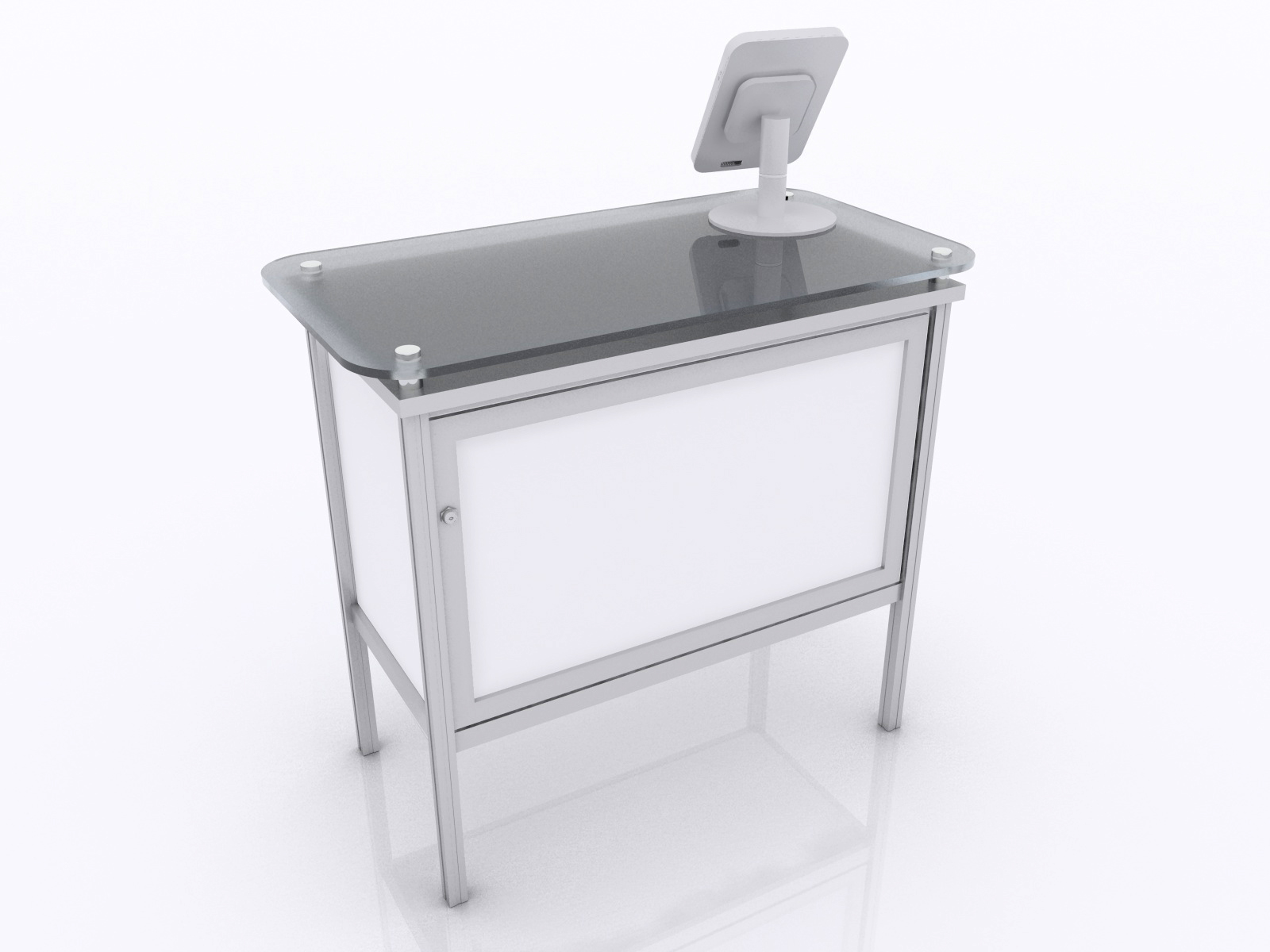 When choosing the right counter or pedestal for your display, consider how you will use it on the show floor. Do you need locking storage? Will the counter or pedestal hold a lead retrieval machine, laptop, or other electrical device? If so, you will need wire management. That may be as simple as ordering a grommet for the counter. If you are planning to use a tablet computer, consider the tablet insert option for the counter top. This option is practical, attractive, and secure for many tablets, such as an iPad.