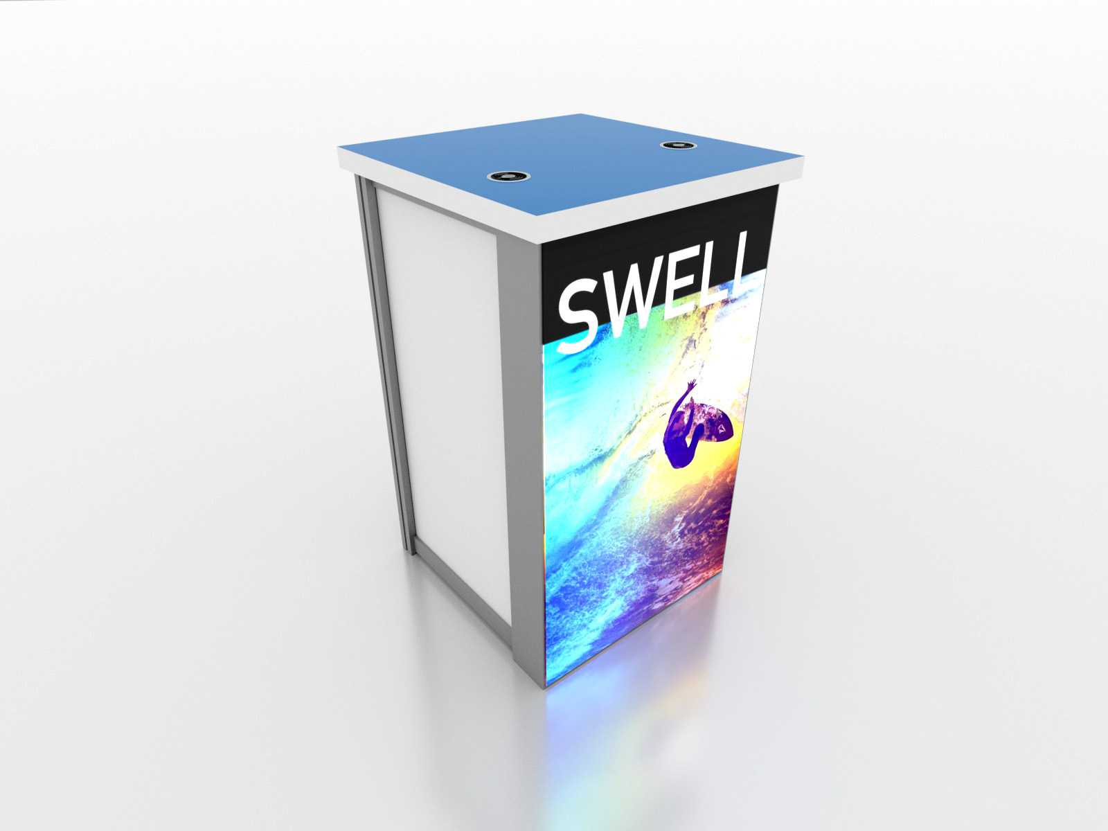 When choosing the right counter or pedestal for your display, consider how you will use it on the show floor. Do you need locking storage? Will the counter or pedestal hold a lead retrieval machine, laptop, or other electrical device? If so, you will need wire management. That may be as simple as ordering a grommet for the counter. If you are planning to use a tablet computer, consider the tablet insert option for the counter top. This option is practical, attractive, and secure for many tablets, such as an iPad.