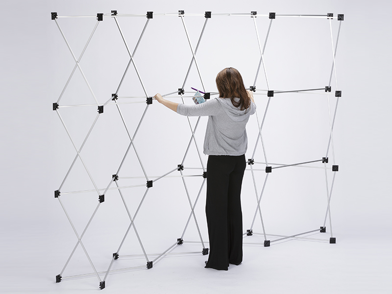 The fabric or graphic panels hang on pins that adhere to detachable steel channel bars with a magnet-to-metal connection. The panels are rollable to fit in the roto-molded case with wheels. The number of panels depends on the size of the frame.