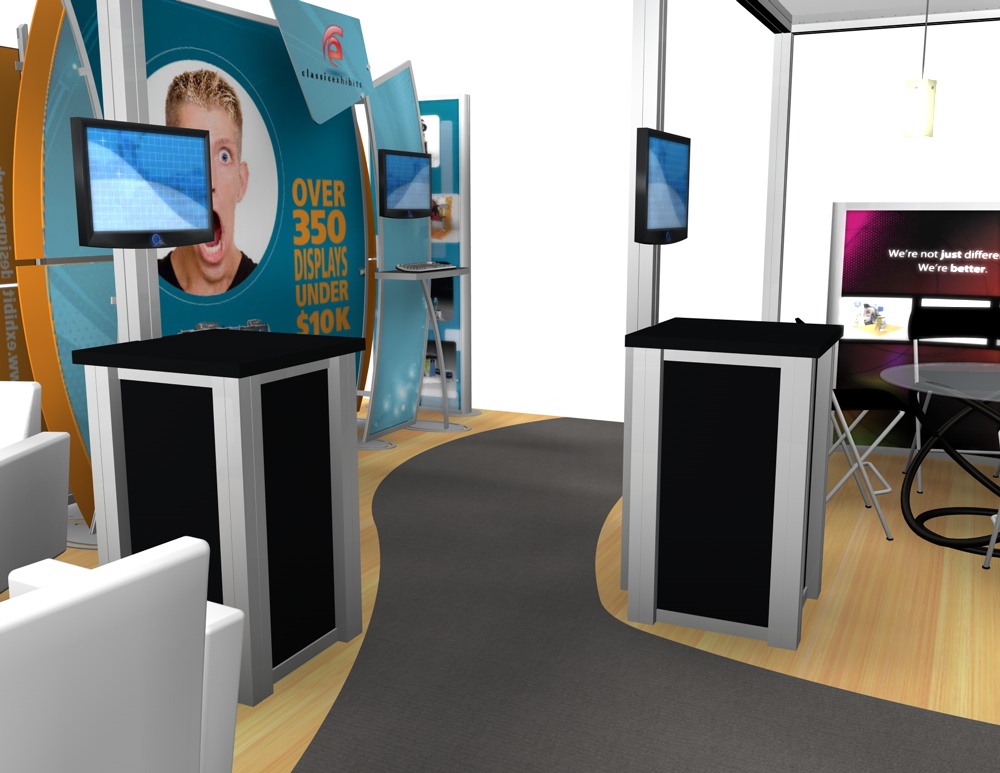 We offer a HUGE selection of contemporary rental accessories, including workstations, kiosks, conference tables, reception counters, display cases, cell phone charging stations, and iPad stands. Any of these components can be integrated into the inline or island designs, or rented as single units to add to your existing exhibit.