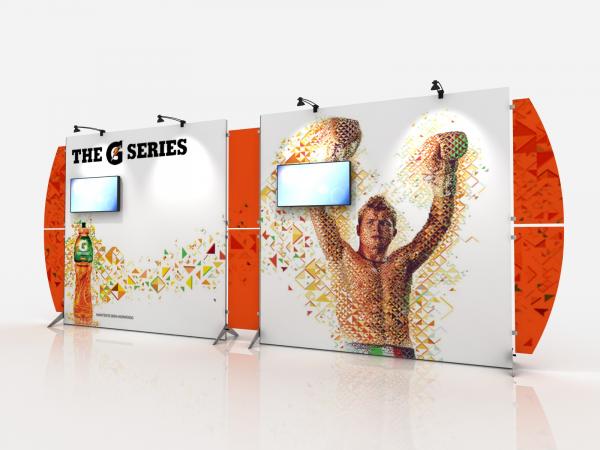 Quite often, a few custom elements added to the design can give the entire design a custom look even if it’s as simple as some colorful laminated workstations, shelves, or a reception counter. Custom laminated soffits and backlighting are also nice touches that are inexpensive and well worth the investment. As a bonus, if you re-rent the same exhibit, your second rental will most likely be less expensive, since your first rental covered the cost of those custom components.