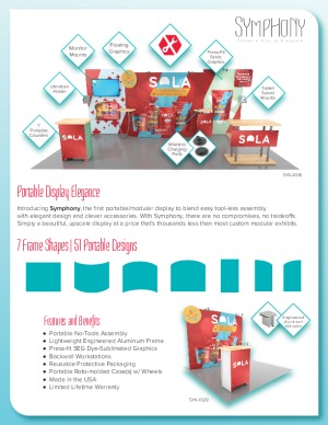 Symphony Portable Displays are unlike any other portable display system in their appearance, assembly, and frame and accessory options. More portables have a few cookie-cutter, rectanglar designs, which look portable. Symphony's modular design allows you to mix and match 7 frame shapes and 16 accessories to create a distinctive upscale appearance. Nothing about Symphony, except the tool-less assembly and packaging, screams portable.