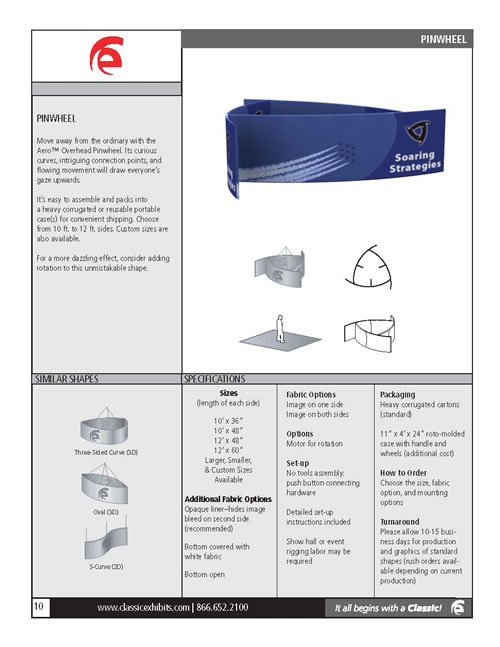 There are over 100 sizes of Aero Overhead Hanging Signs with multiple options for each size, such as one-sided printing, two-sided printing, bottom enclosures, rotating motors, etc.
