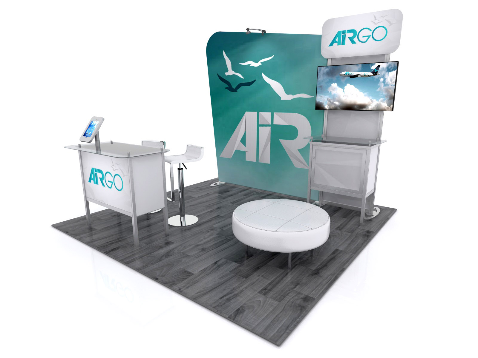The Wow! Factor is often missing for many trade show exhibits. Exhibitors choose a safe display rather than one that's bold and distinctive. The TF-513 and TF-523 feature a powerful visual design with practical features like a large monitor, backwall counter, and locking storage. The MOD-1552 reception counter contributes to the graphic messaging and offers a convenient swivel iPad or Surface Tablet Mount. Add furniture for seating or meeting areas to complete the "meet and greet" mission of your trade show. And because the displays are re-configurable, you can switch between a 10 ft. or 20 ft. inline depending on your show.