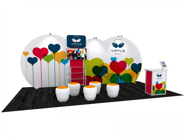 The Wow! Factor is often missing for most trade show exhibitors. They choose a safe display rather than one that's bold and distinctive. The TF-512 and TF-522 feature a flowing, powerful visual design with practical features like a large monitor, shelves, and locking storage. The MOD-1551 reception counter contributes to the graphic messaging and offers a convenient swivel iPad or Surface Tablet Mount. Add furniture for seating or meeting areas to complete the "meet and greet" mission of your trade show. And because the displays are re-configurable, you can switch between a 10 ft. or 20 ft. inline depending on your show.