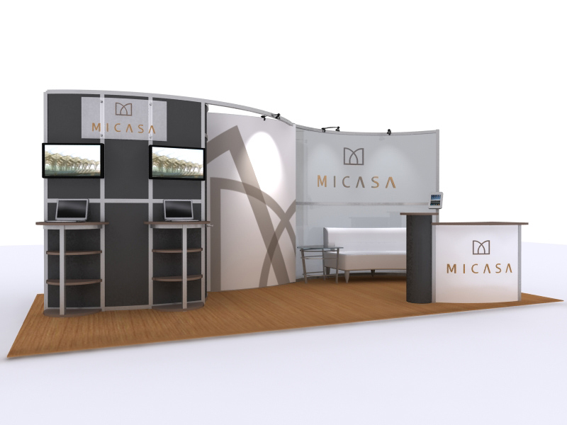 VK-1323 Trade Show Exhibit -- Image 1In a world of garish colors and impractical design, understated elegance stands apart in its ability to convey luxury. The "Micasa" exhibits transform simple curves into an inviting upscale setting with functional multimedia options. The exhibits include large monitor options, iPad presentations in locking clamshell frames, and presentation/lounge areas. The reception counter offers ample storage and large graphics in a sweeping design that invites tradeshow attendees into your booth. Best of all, as your trade show schedule changes, the "Micasa" exhibit expands or shrinks depending on your needs. These hybrid designs look expensive but are very affordable.