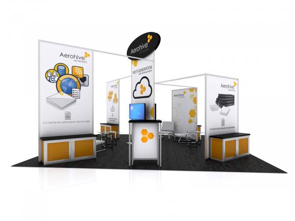 BIG and BOLD exhibitors attract attention on the show floor. You didn't come to the show to be a wallflower, so be seen throughout the show hall with the VK-5126. This cost-effective island includes five double-sided towers ranging in height, up to over 12 ft. tall. There's ample storage with double-door cabinets and countertops for products, brochures, or the latest promotional giveaway. The two large monitor stands complement the graphics with an interactive presentation or access to your website. There's even a reception pedestal and room for casual seating so attendees can get to know you.